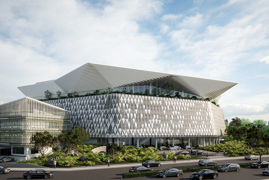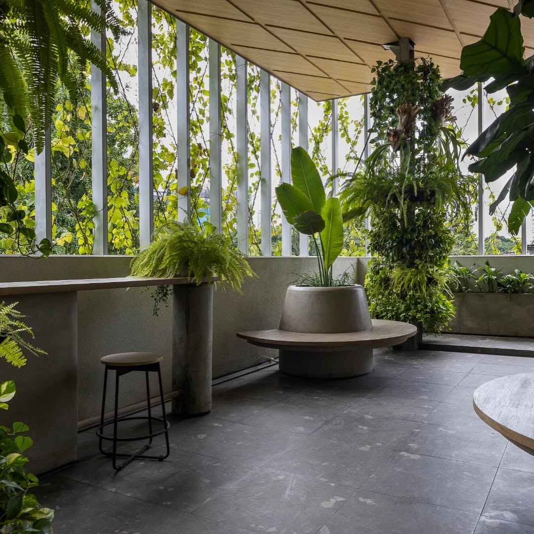Bangunan ini merupakan hasil transformasi dari struktur lama yang sempat terbengkalai menjadi volume arsitektur hijau yang tampak “mengambang”. Dengan desain yang hadirkan elemen vegetasi dan pelindung dari sinar matahari, bangunan ini bawa suasana teduh bagi penggunanya sekaligus berikan pemandangan luar yang lebih segar dari hiruk pikuk Jakarta.